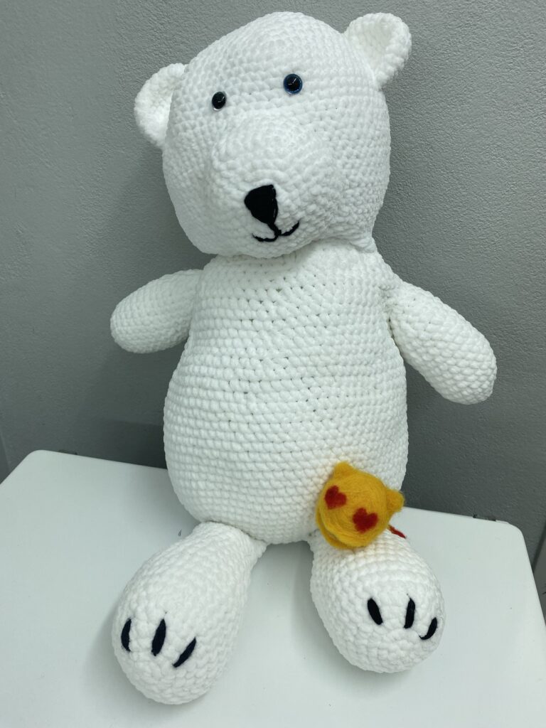 Nach dem Häkeln wurden die Formen mit Watte gefüllt, um Volumen und Stabilität zu erzeugen. Sicherheitsaugen, kleine Applikationen oder aufgenähte Details gaben den Figuren ihren individuellen Ausdruck. Die Chenille-Wolle verstärkte den weichen, plüschigen Charakter der Tiere, was sie besonders kindgerecht macht.