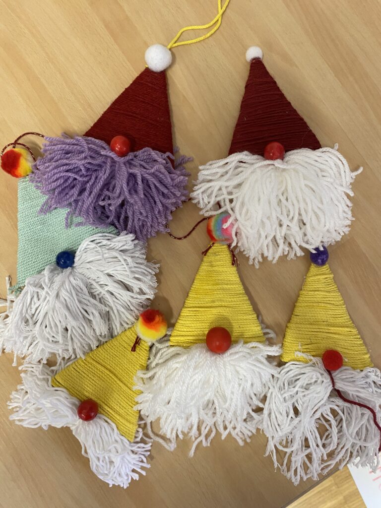 • Wichtel, deren charakteristische Mützen aus Wollresten gewickelt und mit Bommeln, Holzperlen oder Fäden ergänzt wurden
