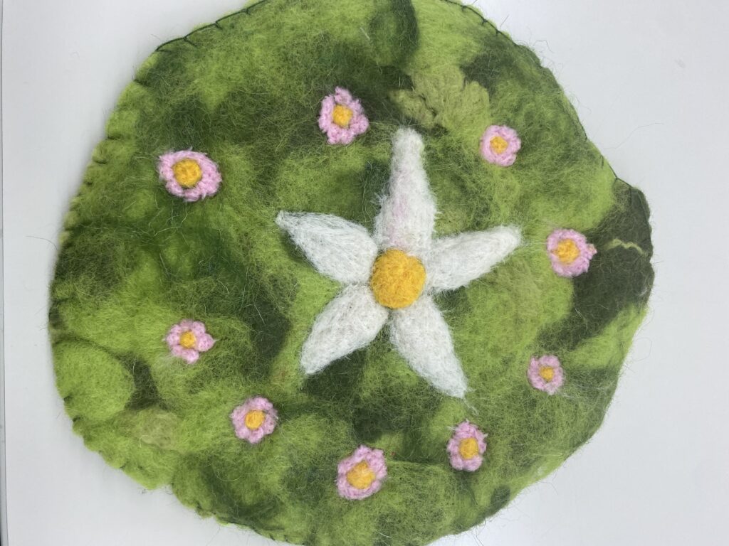 Schafwolle (natur und gefärbt), heißes Wasser, neutrale Seife, Luftpolsterfolie, Plastikfolie, Plastikgewebe als Schablone, Gewebe-Tischset